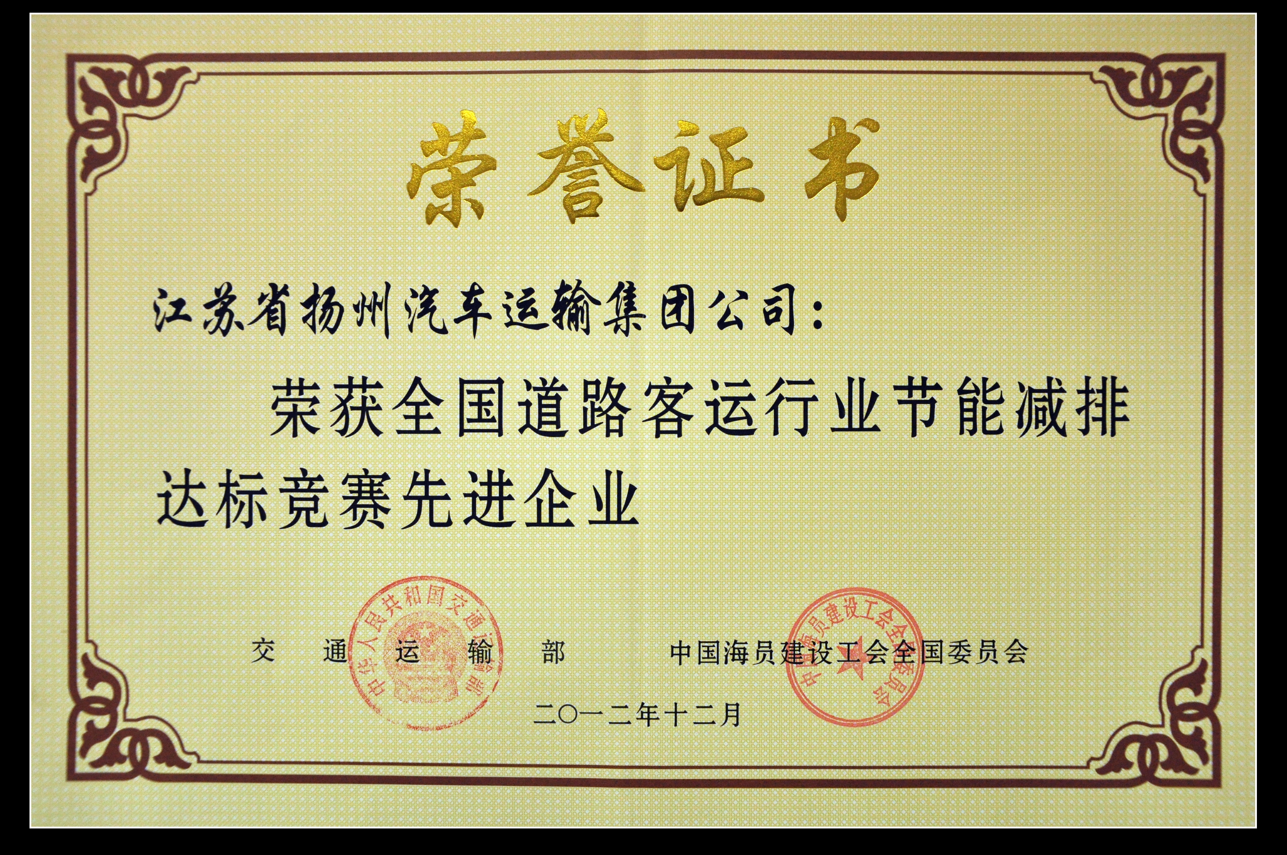 > 我司榮獲“全國道路客運(yùn)行業(yè)節(jié)能減排達(dá)標(biāo)競(jìng)賽先進(jìn)企業(yè)”稱號(hào)